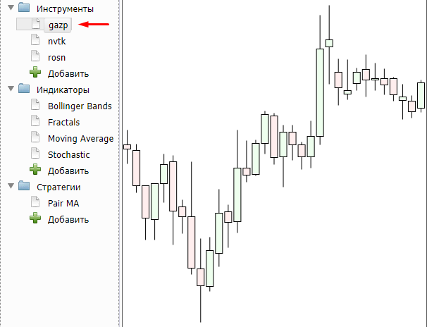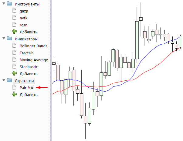 Ниже рассмотрим процесс тестирования уже готовой стратегии на основе двух скользящих средних "Pair MA", которое добавляется в аккаунт при регистрации.