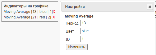 В блоке "Индикаторы на графике" отображается список индикаторов на экране. Сделав двойной клик по элементу списка, можно настроить параметры каждого индикатора.