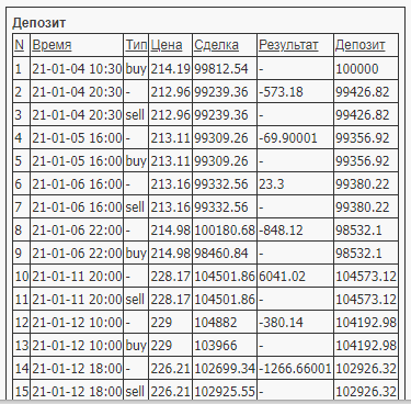 По ходу процесса в блоке "Депозит" будет отображаться таблица со сделками и изменением депозита, который равен 100 тысяч рублей на начало тестирования.
